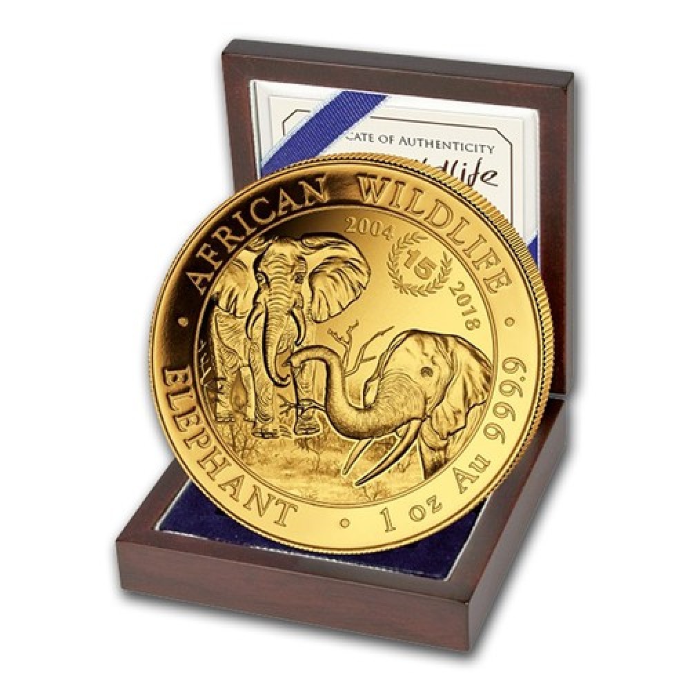 Szomália Elefánt 2018 1 uncia arany pénzérme "15 éves jubileum" G-SO-Eleph1oz18ANN