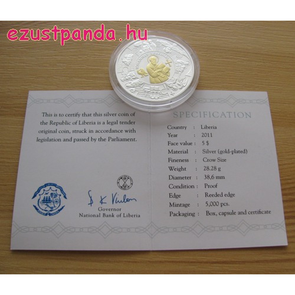 Szent János apostol - Libéria 2011 aranyozott proof ezüst pénzérme S-LR-ApJohn11