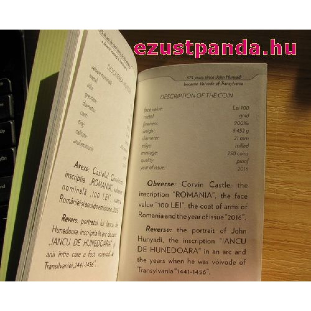 Hunyadi János erdélyi fejedelem 2016 arany pénzérme - csak 250 példány! G-RO-Hunyadi16PP