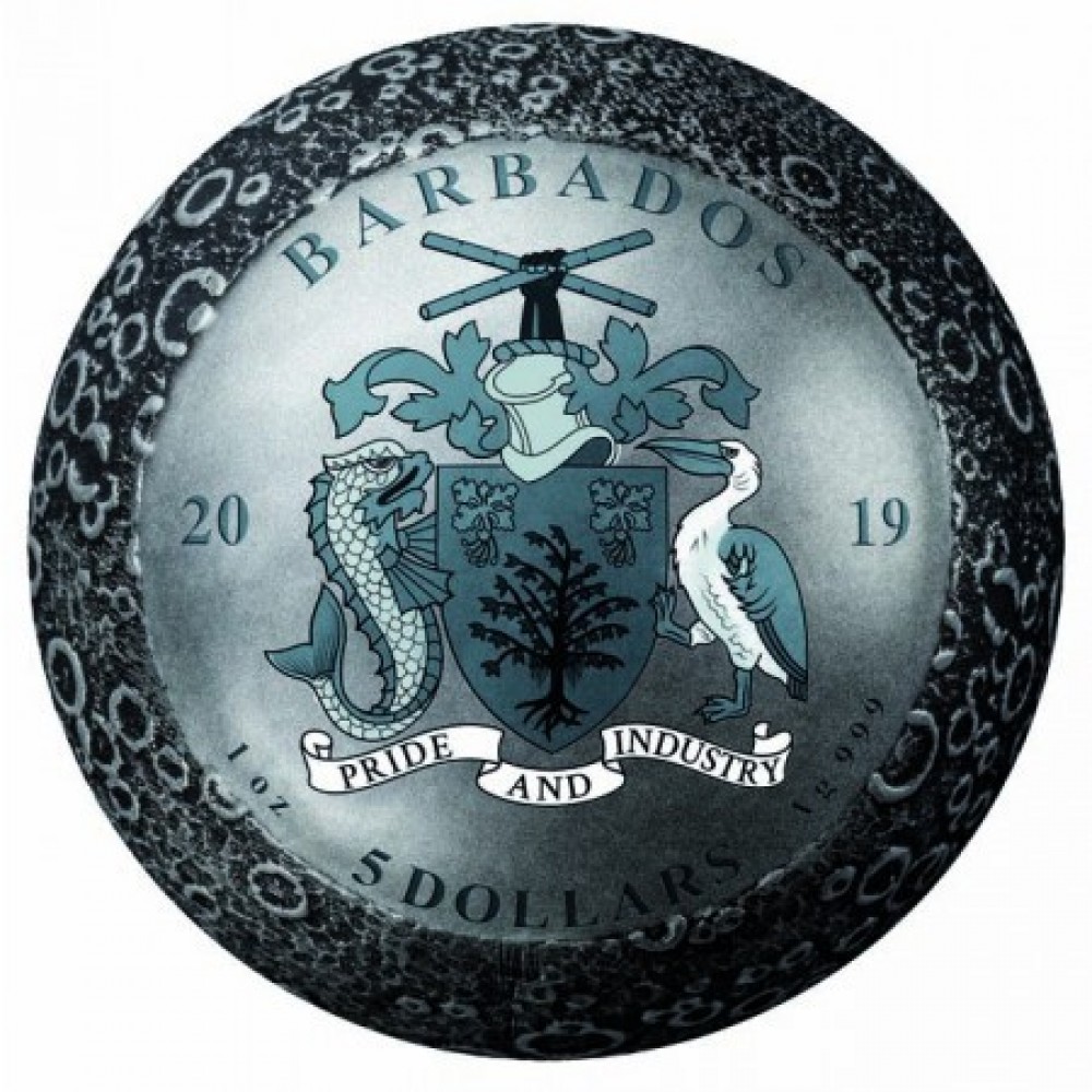 Holdraszállás 2019 1 uncia gömbölyű, antikolt ezüst pénzérme Barbados S-BB-MoonSpher19PP